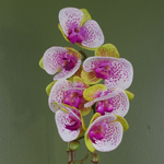 Botanik orchid plant. Measures: 46cm tall x 15cm x 15cm. The overall measurement is given at the tallest point as measured from the floor. This plant is potted in a plastic weighted pot.Realistic artificial orchid plant with real touch leaves, glued fixed gravel base, potted in a plastic decorative pot as shown. 7 real touch flowers. Pot is plastic and measures 9cm (h) x 10cm (w) Overall height as arranged in our photos 46cm. Stems are wired and this plant can be arranged to your requirements.