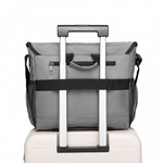 The bag has an adjustable shoulder strap, a top handle and a strap on the back for attaching to the luggage.