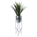Leaf Design metal planter. Measures: 90cm tall x 19cm x 19cm. The overall measurement is given at the tallest point as measured from the floor. Metal. This metal planter and artificial yukka set together measure 90cm tall. The plant and planter are two separate items and can be used together or individually. The planter on its own measures 19cm wide x 55cm high at widest points - the plant on its own measures 60cm tall and comes pre - potted in a weighted base which is 14x12cm. The planter and stand are made of metal - the plant is artificial with thick plastic leaves that need no arranging. We have this particular design available in a choice of colours. The size of the top planter is 18cm wide x 19cm tall so it will fit any of our small or medium plants perfectly. These products are all hand made in a rustic finish with intentional minor imperfections. Intended for indoor use.