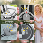 • Rotating seat allows face-to-face interaction for closer parent-child bonding