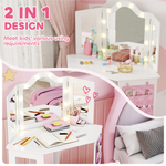 The AIYAPLAY kids dressing table set exudes glitz and glamour, with 10 vibrant dual-colour LED bulbs around the mirror, illuminating their space. It features a main mirror and two adjustable side mirrors for different angles during hair styling and makeup. Made from MDF with smooth edges for safety, it offers a spacious desktop that can serve as a makeup station, reading area or arts and crafts space. Suitable for ages 3-8 years, it grows with your child.