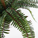 Leaf Design artificial plant. Measures: 40cm tall x 60cm x 60cm. The overall measurement is given at the tallest point as measured from the floor. This plant Comes in a ceramic pot as shown. Highly realistic palm in a decorative ceramic vase planter - ready to display straight out of the box. Thick dense leaves with individually shaped fronds. The stems are wired and the leaves can be shaped to fit your space. As we have the fern arranged in our photos it measures 40cm x 60cm x 60cm. The decorative ceramic vase planter measures 14cm (h) x 13cm (w). The leaves are plastic. The ceramic decorative planter is topped with fixed pebbles for an attractive low maintenance finish.