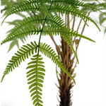 Artifical fern tree potted in black plastic pot, ideal for placing inside a larger decorative planter of your choice. Tree when measured as arranged in our photos is 120 x 90 x 90cm. Plastic base pot measures 15cm x 12cm. Leaves plastic. Trunk artificial.