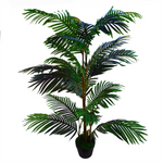 Leaf Design artificial plant. Measures: 140cm tall x 80cm x 80cm. The overall measurement is given at the tallest point as measured from the floor. This plant is potted in a plastic weighted pot.Our artificial palm trees have incredible attention to detail and will certainly make your home feel more tropical. These look brilliant in conservatories - bathrooms or hallways and add a splash of greenery with no need to water or maintain them. With a realistic leaf structure and beautiful green fronds this is a really attractive artificial plant. This artificial tree stands 140cm high when arranged as shown in the pictures. Stems are wired so this can be arranged to fit your space perfectly. It is highly realistic with botanically accurate foliage. It comes potted in a plain plastic pot and is ready to display. You can easily put this inside a larger planter if you wish. Plastic pot measures 17cm (d) x 15cm (h) approx.