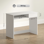 Efficiently save space with this computer desk from HOMCOM. Featuring a keyboard tray and a drawer, it saves a lot of desktop space. Constructed of particle board with white surface, it's easy to maintain and brings you the atmosphere of nature. Its contemporary look will blend beautifully into any style decor. It's a great choice for you to have this desk in your study, office, or bedroom to enrich your furniture while saving space!