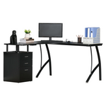 Modern and sleek, this work desk from HOMCOM looks as good as it feels when working, supporting you properly when you need to focus hard. Its 'L' shaped design fits perfectly into corners to help utilise space more efficiently. The frame is made from steel frame for a tough structure, fitted with MDF shelves so you can work well. There's plenty of space to work and have your computer and other devices on top. It's finished with a three-drawer cabinet so you can keep papers and more safely stored.