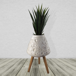 Leaf Design large planter. Measures: 62cm tall x 40cm x 40cm. The overall measurement is given at the tallest point as measured from the floor. fibreglass composite Planter with Wooden Legs. Product supplied by Leaf...