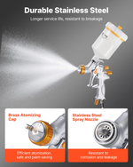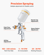 Operating Pressure: 29-36 PSI,Paint Delivery Rate: 160-240 ml/min,Paint Flow Adjustment: Yes,Air Inlet Size: 1/4" NPT,Paint Cup Capacity: 0.16 gallon / 600 ml,Product Dimensions: 8.66 x 3.94 x 14.57 in / 220 x 100 x 370 mm,Air Consumption: 5-10 CFM,Product Type: HVLP Spray Gun,Nozzle Quantity: 3,Nozzle Sizes: 1.3 mm Pre-installed / 1.4 mm / 1.7 mm,Air Pressure Adjustment: Yes,Item Model Number: RF6000AG,Net Weight: 2.71 lbs / 1.23 kg,Main Material: Stainless Steel & Brass