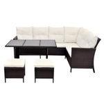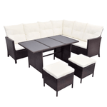 This garden sofa set combines style and functionality and will become the focal point of your garden or patio. The set has a sturdy steel frame covered in weather-resistant and waterproof PE rattan, which is easy to clean, hard wearing and suitable for daily use. The cushions are highly comfortable. The easy-to-clean polyester covers with zips can be removed and washed. This flexible rattan table and chair set can be easily moved to suit any setting. Assembly is easy. Delivery includes 1 L-shaped sofa, 1 table, 2 stools, 7 back cushions and 8 seat cushions. Note: We recommend covering the set in the rain, snow and frost.