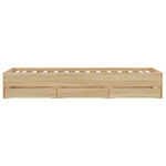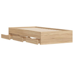 Add a modern touch to your bedroom with this bed frame with drawers! It makes a practical and decorative addition to your living space. Durable material: The bed frame is made of engineered wood. The engineered wood is of exceptional quality with a smooth surface and also features strength, stability, and resistance to moisture.Sturdy slats: The plywood slats provide good weight distribution, ensuring the mattress stays in place with every twist and turn of your body during sleep.Storage function: The included bed drawers provide ample storage space for storing your essentials, keeping your room clean and tidy. Good to know:A mattress is not included with this bed. We do offer a various selection of mattresses. You can check our shop for a matching mattress.