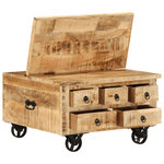 This industrial-style wooden coffee table exudes a vintage charm and will make a timeless addition to your home. The coffee table can also be used as a side table or end table. The coffee table is handmade of solid rough mango wood which is stable, durable and beautiful, and the craftsmanship adds to its spectacular retro style. Every step of the process is carried out with the greatest care, be it polishing or lacquering. The craftsmanship and the beautiful wood grains make every piece of furniture unique and slightly different from the next. In addition, the 5 drawers and the large interior compartment provide ample space for any items you'd like to keep within reach. The table is equipped with 4 iron wheels that make it easy to move around and complete the industrial look. Important note: The colours vary from piece to piece, making each of our tables unique. The delivery is random, ensuring the exclusivity and individuality of your product.