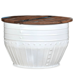 This unique, industrial wooden coffee table will make a timeless addition to your home. The unique barrel-shaped base gives the table an industrial flair. This couch table has a solid wooden tabletop, ideal for placing...
