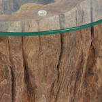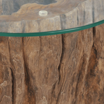 This coffee table features a solid teak base and will make a distinctive addition to your home decor. The tabletop is made of tempered glass and has space for your drinks, vases, fruit bowls or ornaments. It can also be used as a side table. The stable and durable table's base in tree log style is made of high-quality teak. Assembly is easy. Important note: As wood is a natural product, the colours, grain patterns and shapes vary from piece to piece, making each of our coffee tables unique and different from the next. The delivery is random, ensuring the exclusivity and individuality of your product.