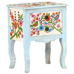 This unique, beautiful wooden bedside cabinet, adorned with rich, hand-painted decorations, makes an eye-catching addition to your bedroom with its colourful design. The nightstand features extensive hand-painted decorative details, which create a warm and cheerful effect. This side cabinet has a sturdy top to place a bedside lamp, alarm clock or anything else you might need near your bed. The two drawers provide ample space for keeping all kinds of smaller items organised and within reach. The bedside stand is made of solid mango wood, a tropical hardwood. It has the strength to bear the weight and also stand the wear and tear of time. Additionally, the exquisite craftsmanship makes every piece slightly different from the next. Important note: The colours vary from piece to piece, making each piece unique. The delivery is random, ensuring the exclusivity and individuality of your product.