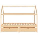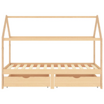 This wooden kids bed frame with drawers is a practical and decorative addition to any bedroom decor. The bed is smartly designed with a tree house style frame where you can hang bed curtains to create privacy for your kid. It can also be used as a reading book or a play house for your child. Made of solid pine wood, this bed frame is exceedingly sturdy and durable. The strong slats offer the needed support and are highly comfortable. The included bed drawers provide ample storage space for storing folded clothes, toys, etc., keeping your room clean and tidy. The easy-glide wheels can work on both carpeted and wooden floors. This bed frame is suitable for a mattress of 90 x 200 cm. Please note that delivery includes a bed frame only; a mattress and curtains are not included. The bed is easy to assemble. You can check our shop for the matching mattresses.