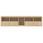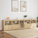 Decorate your room with this modern sideboard with LED lights, it easily blends with furniture in any style at your house. Durable material: The engineered wood is of exceptional quality with smooth surface and also features strength, stability and resistance to moisture.RGB LED lights: The buffet is equipped with vibrant RGB LED lights. With various customisable menus, you can effortlessly change the colour of the lights and even set them to adjust automatically. These LED lights not only enhance the contemporary look of the sideboard cabinet but also add to its trendy appeal.Ample storage space: The storage cabinet offers plenty of space to keep your everyday items neatly arranged and easily accessible.Displaying function: The sturdy top of the hallway cabinet is ideal for displaying decorative objects, photo frames, or potted plants.Practical doors: Keep your essentials free from dust by hiding them behind the doors of the side cabinet. Good to know:The product has a USB connector that requires a certified 5V USB power source (not included). Warning:To prevent it being overturned, this product must be used with the provided wall attachment device.