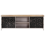 Introduce a touch of elegance and convenience to your interior decor with this trendy wooden TV cabinet! Made of rough mango wood and iron, this HiFi cabinet is durable and sturdy. You can place your TV, router, multimedia appliances, or display decorative items like photo frames, fruit baskets, or vases on the sturdy hardwood top. Equipped with 2 doors and 2 compartments, the TV unit offers ample storage space for various small items. Additionally, the doors are made of real bicycle chain wheels, which are stylish and unique. Important note: Colours and grains vary from piece to piece, making each piece unique. The delivery is random as well.