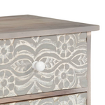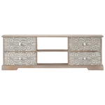This wooden TV cabinet with exquisite carved patterns will make a timeless addition to your interior. This HiFi cabinet is made of solid acacia wood that has been given a white finish to give it a beautiful look and bright colour. The craftsmanship and the graceful wood grains make every piece of furniture extraordinary and slightly different from the next. Additionally, the perfect craftsmanship guarantees that every step of the process is carried out with the greatest care, be it polishing, painting and lacquering. The elegant hand-carved patterns on the drawer front surface add to the cabinet's beauty. This lowboard features 4 drawers and 2 compartments, providing ample space for keeping your multimedia devices, books, as well as various items neatly organised. Important note: The grains vary from piece to piece, making each piece unique. The delivery is random, ensuring the exclusivity and individuality of your product.