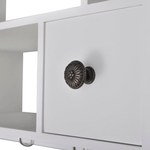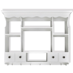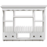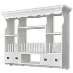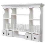 This elegant wooden wall cabinet in antique look offers plenty of storage and organisational options for virtually any kitchen, and will help to keep your kitchen neatly organised. The cabinet has four drawers and four shelves, allowing you to easily store cereal, spices, snack foods, canned goods and much more. The pegs keep your plates and dishes in place. The drawers are easily opened, so you can quickly get the things you need. It is equipped with hooks, for hanging mugs or towels. Made from high quality wood, this cabinet is designed to withstand a humid environment. The white paint finish makes it easy to clean with a damp cloth.